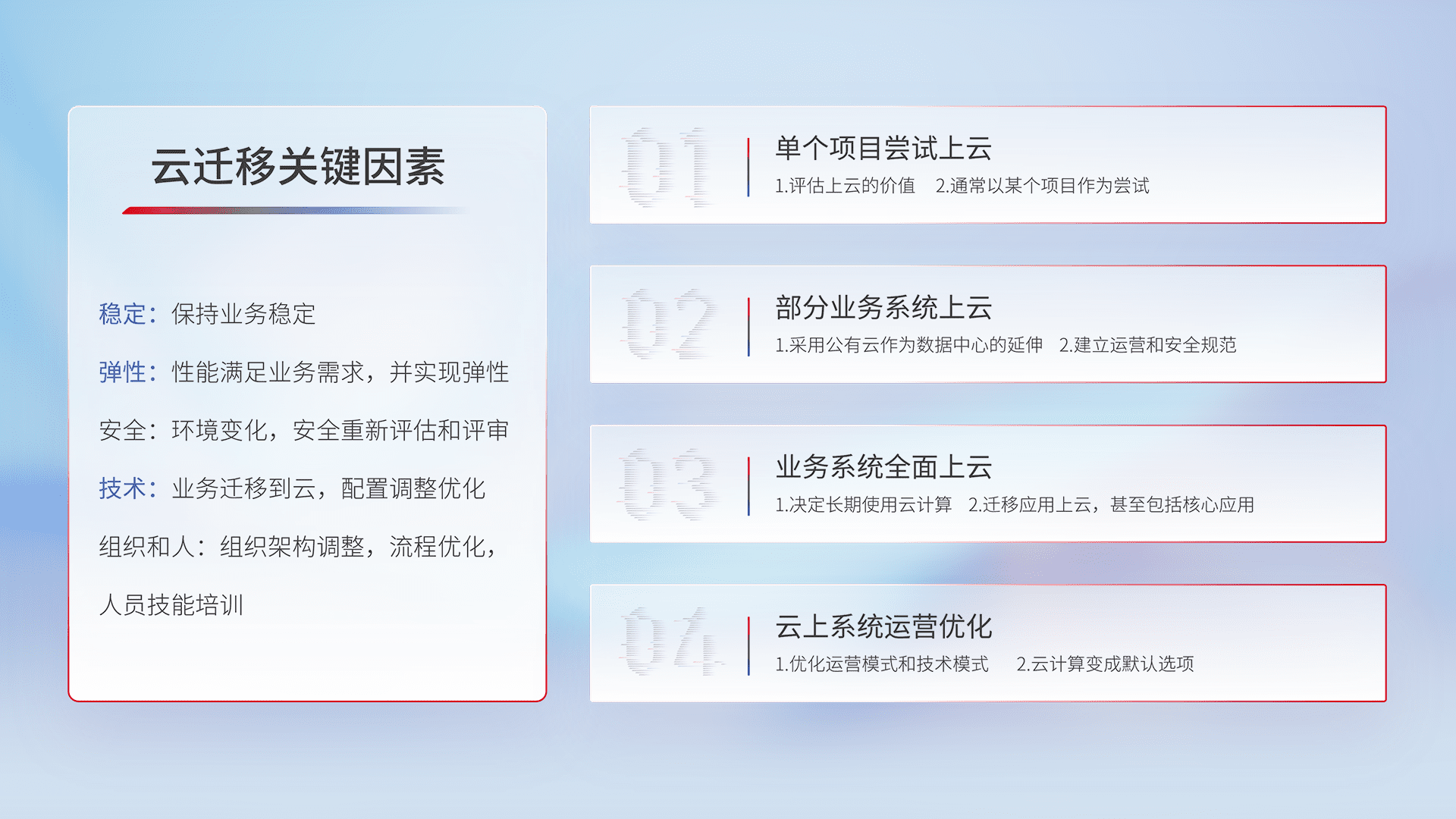 结合实际业务,,,从规划设计、、云平台选型、、、云原生改造、、、、数据迁移、、、集成交付,,迁移全过程为客户识别最佳上云路径,,,,做好风险识别管理,,,设计网络架构、、、身份权限、、、安全审计合规、、、、操作审计、、、日志审计、、、、监控告警策略、、、、多站点容灾设计等,,,,对云上基础设施进行整体规划,,,提升IT治理水平,,,,以满足弹性、、、、高可用、、、、高性能的需求。。